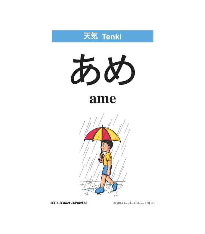 Las tarjetas presentan 64 palabras y frases básicas que cubren la gama completa de sonidos en japonés y están organizadas en categorías temáticas, como por ejemplo: gente, colores, animales, comida, partes del cuerpo, ropa y lugares.