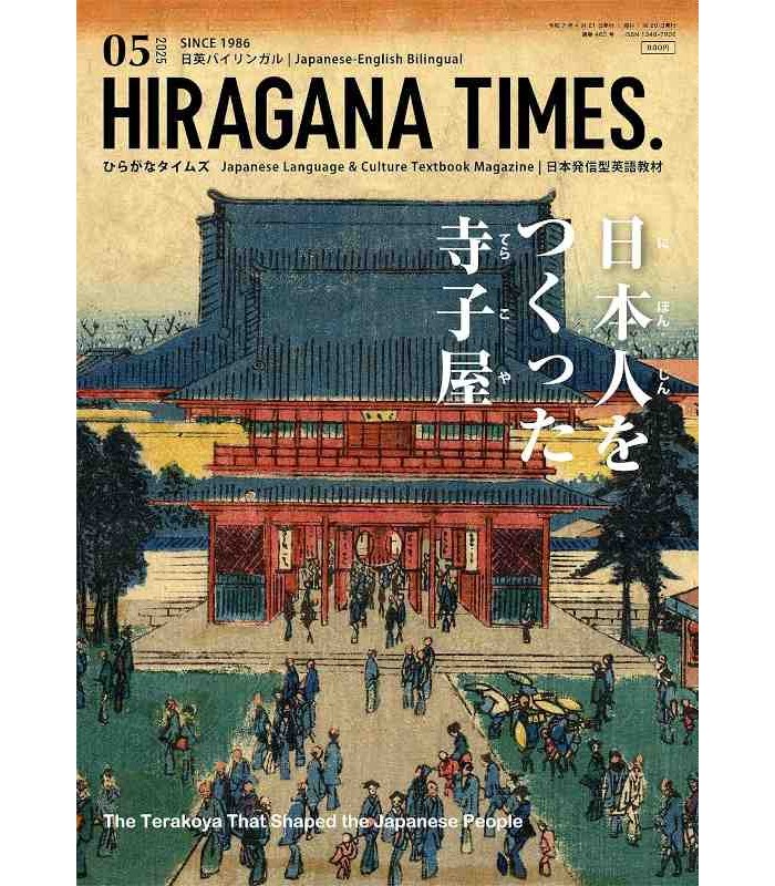 Edição de maio de 2025 da revista bilingue Hiragana Times, uma publicação que analisa a atualidade japonesa. Esta revista é escrita em japonês com furigana e cada um dos textos é acompanhado por traduções em inglês.