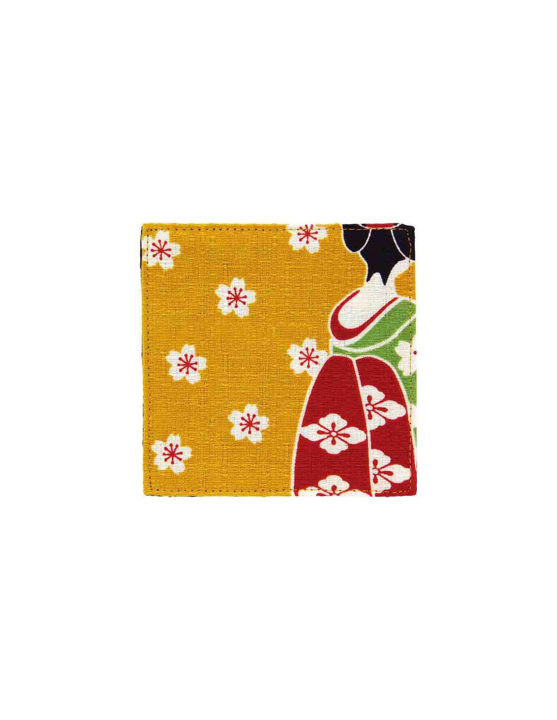 Porta-copos Reversível Kurochiku – Modelo: Maiko Ki, destaca-se pelo seu design reversível, oferecendo duas estampas diferentes, uma em cada lado. O motivo apresenta um estilo tradicional japonês com ilustrações de uma Maiko e flores de cerejeira (Sakura) sobre um fundo amarelo vibrante.